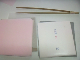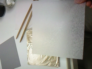 左からロー引き紙・洋箔(赤口)、上のが箔箸です。
